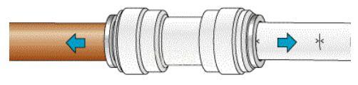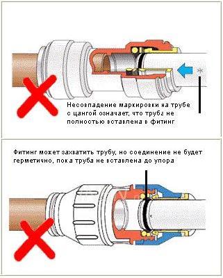 Вставьте трубу в фитинг до упора. Если труба отрезана правильно, то отметка на трубе
