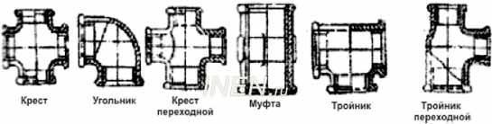 При монтаже трубопроводов небольших диаметров часто используются разборные резьбовые соединения (сгоны, бочата, кресты, угольники, тройники, муфты, резьбы, контргайки). Кресты, угольники, тройники и муфты выпускаются в вариантах для соединения трубопроводов одинакового диаметра, а также различных диаметров (переходные). Фитинги могут быть из ковкого чугуна, стальные или оцинкованные. Уплотнителем для резьбовых соединений служит лента из фторопластового уплотнительного материала или льняная прядь. Основные размеры и конструкции фитингов вы можете уточнить в нашей организации.
